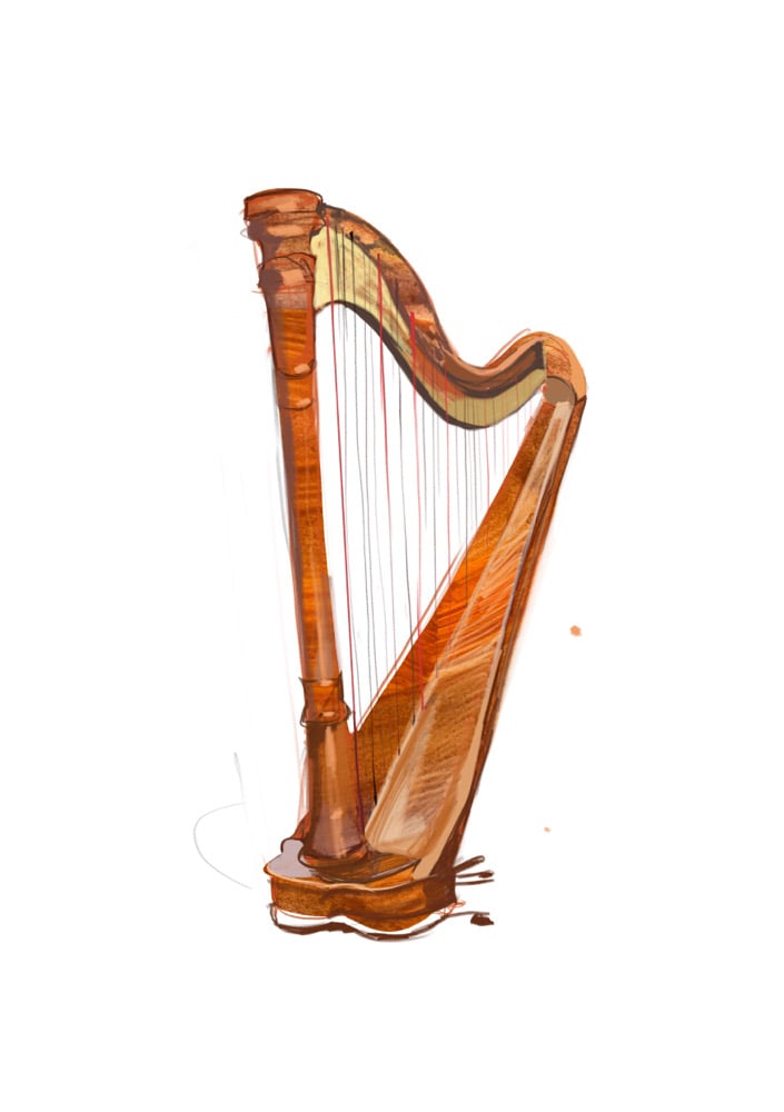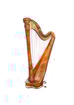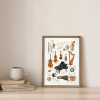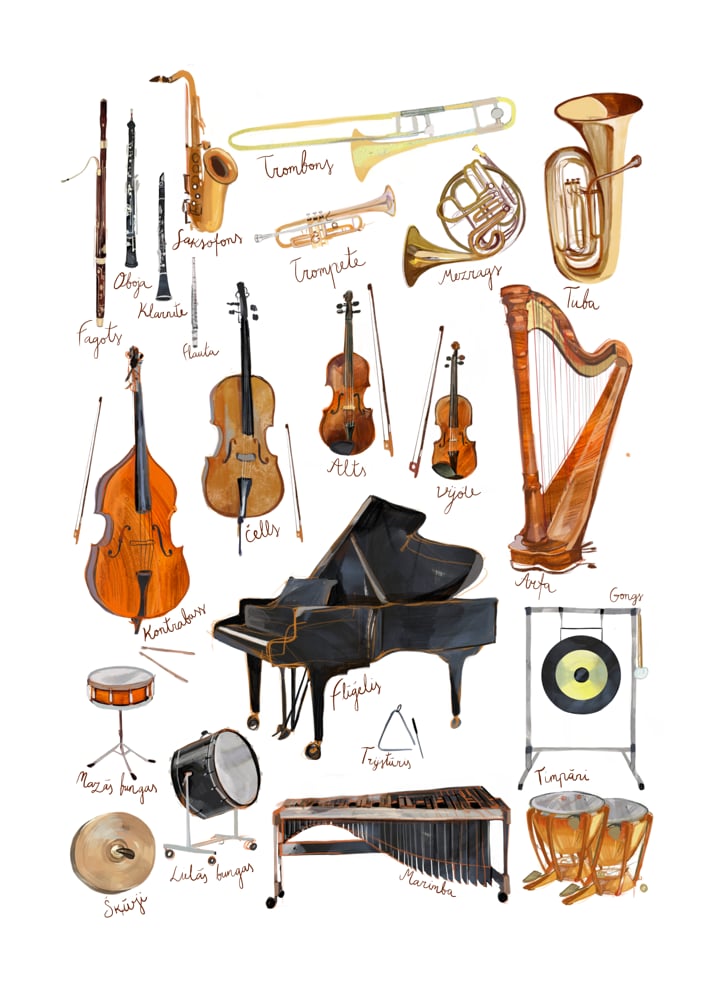 Plakāts Orķestris, kas attēlo orķestra instrumentus.